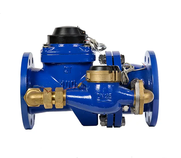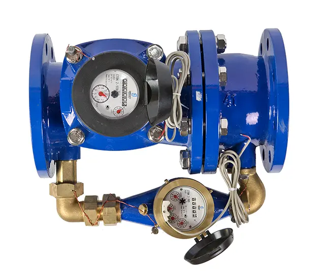 Комбинированные счетчики разработаны специально для объектов с широким диапазоном расхода воды, непостоянным уровнем расхода, варьирующимся в течение суток, сезонов или условий технологического процесса, объектов кратковременного учета большого расхода, где при нормальной ситуации протекает небольшое количество воды. Составные элементы комбинированного счетчика воды представлены на рисунке 12. Конструктивно в устройстве расположены два счетчика и переключающее устройство — пружинный перепускной клапан, который в зависимости от величины расхода направляет поток при малых значениях расхода через вспомогательный счетчик, а при больших через основной и вспомогательный счетчики: основным является турбинный счетчик для больших расходов, крыльчатый счетчик для малых расходов вспомогательный. За счет этого достигается возможность точного измерения на объектах с широким диапазоном как на малых, так и на больших расходах воды. Основной и вспомогательный счетчики могут быть расположены в одном корпусе (например, комбинированный счетчик воды ООО «Декаст» СТВК 1) либо располагаться в отдельных корпусах (например, комбинированный счетчик воды ООО «Декаст» СТВК 2).
